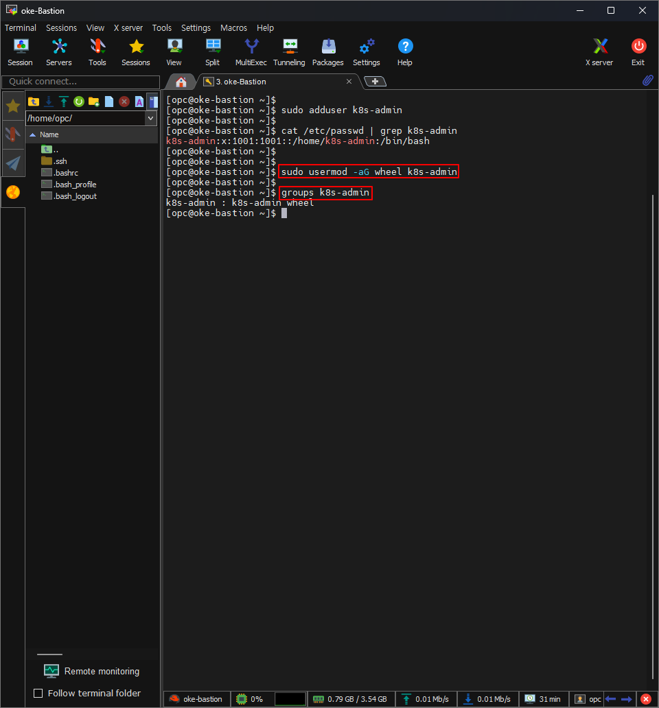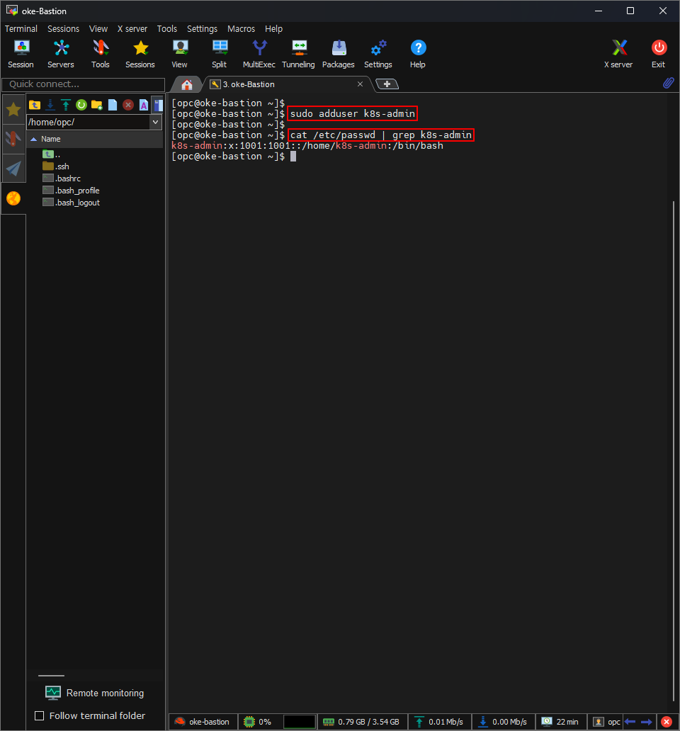 [opc@oke-bastion]$ sudo adduser k8s-admin