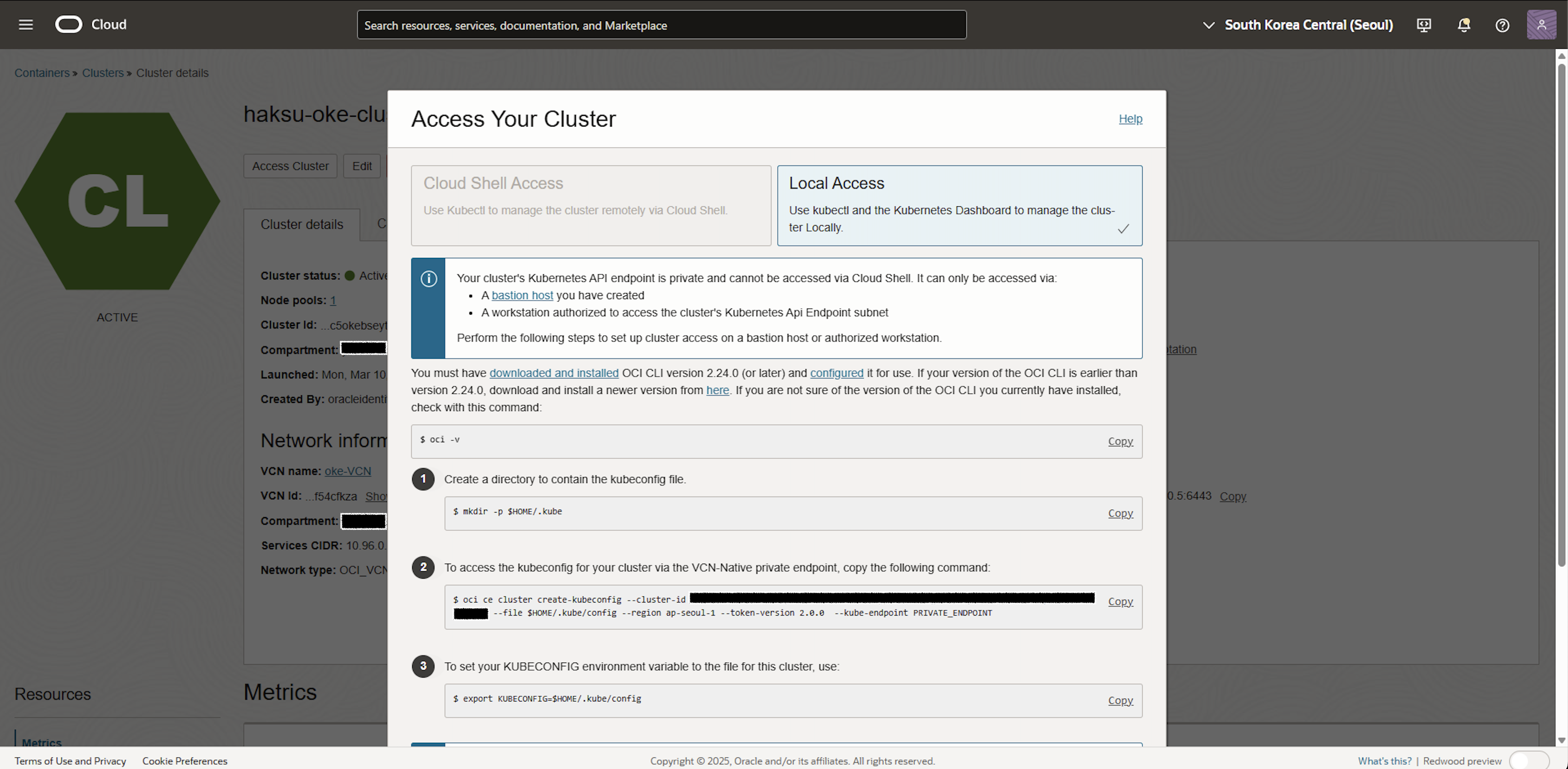 [k8s-admin@oke-bastion ~]$ oci ce cluster create-kubeconfig --cluster-id <Cluster OCID> --file $HOME/.kube/config --region ap-seoul-1 --token-version 2.0.0 --kube-endpoint PRIVATE_ENDPOINT