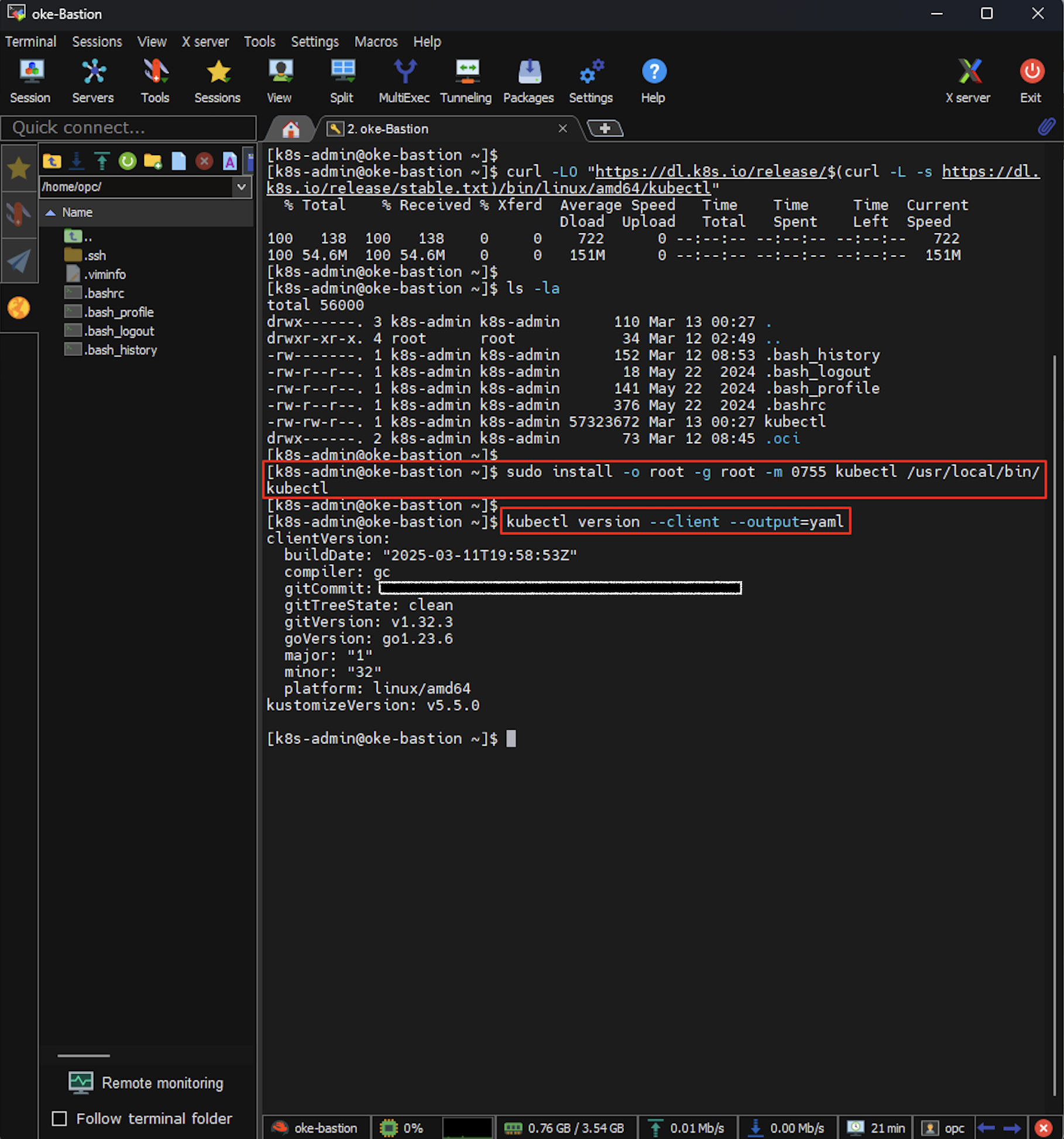 [k8s-admin@oke-bastion ~]$ sudo install -o root -g root -m 0755 kubectl /usr/local/bin/kubectl