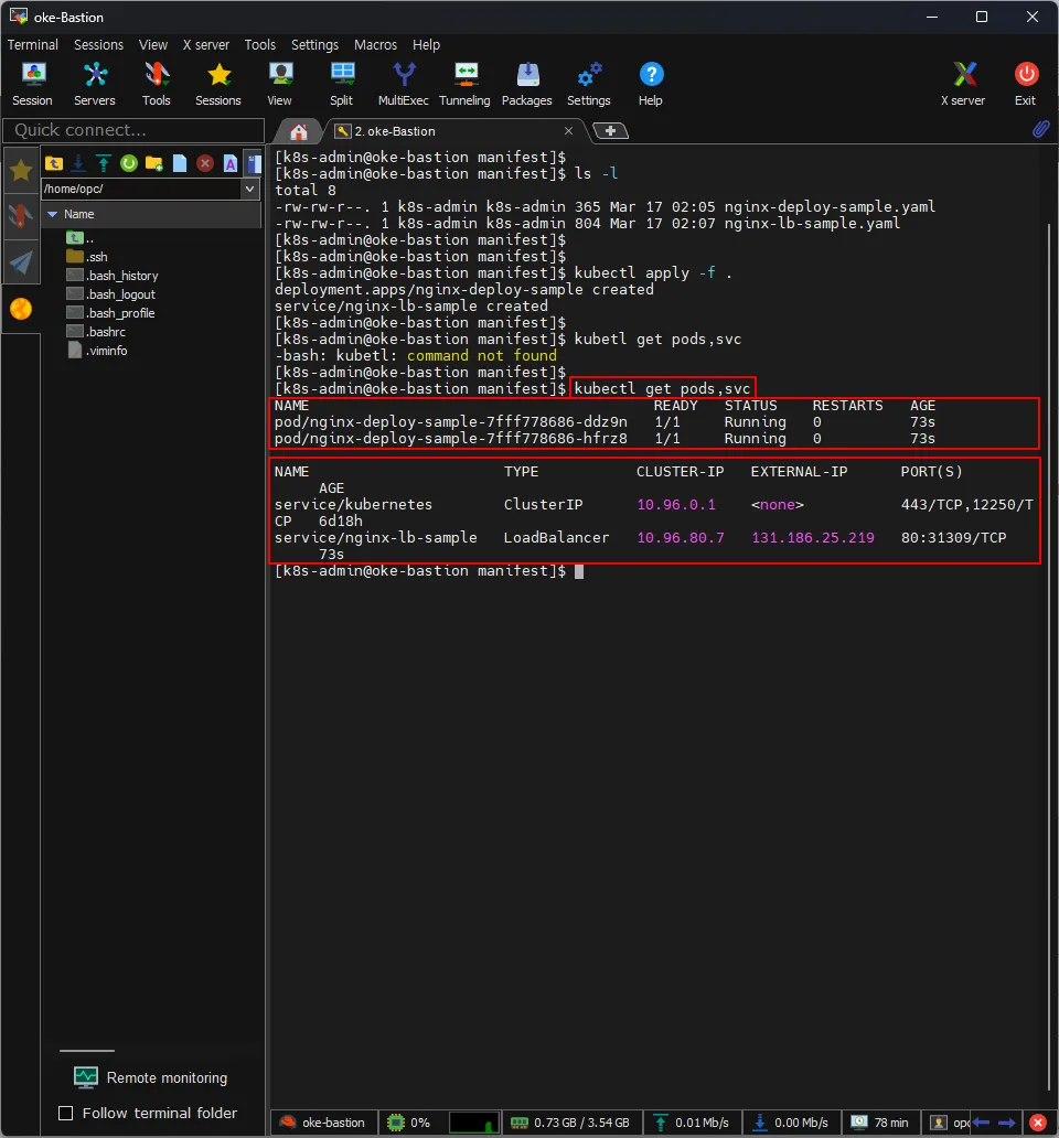 [k8s-admin@oke-bastion manifest]$ kubectl get pods,svc