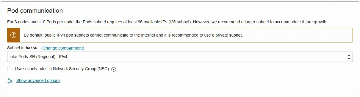 - Cluster 생성 시, VCN-Native Pods Networking CNI 선택하는 경우 아래와 같은 Pod communication 항목 설정 필요(Flennel 선택 시 아래 항목 표시되지 않음)
