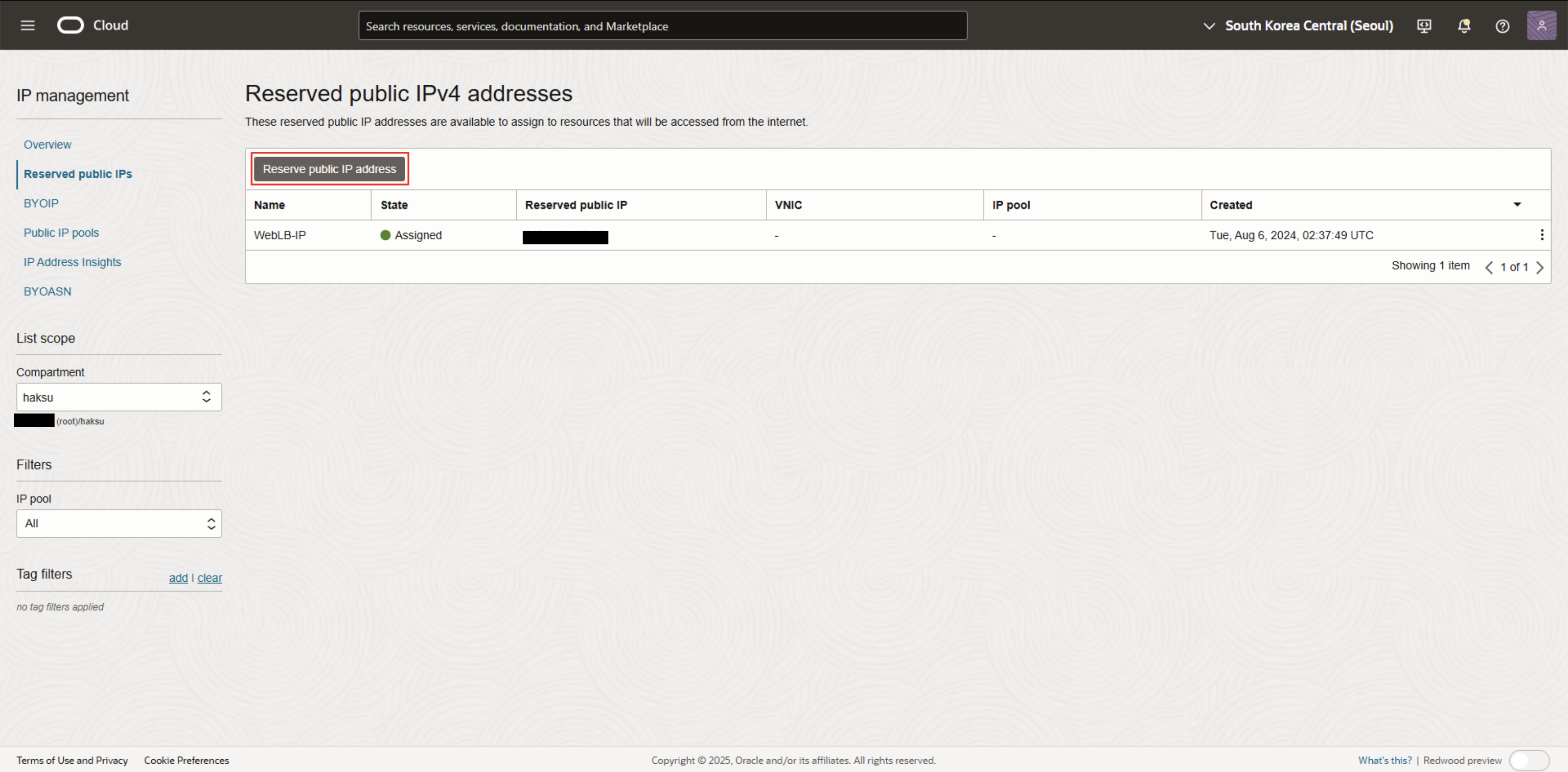 1. 내비게이션 메뉴 → [Networking → IP management → Reserved public IPs] 선택