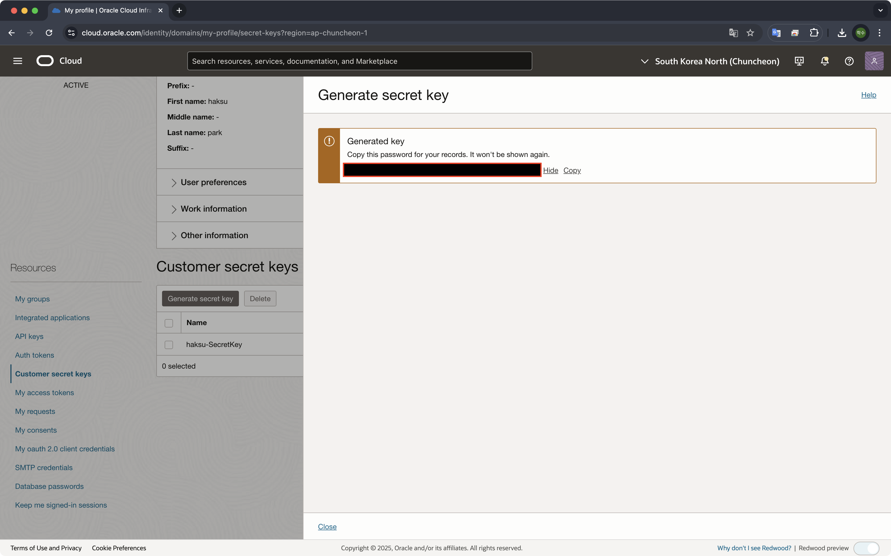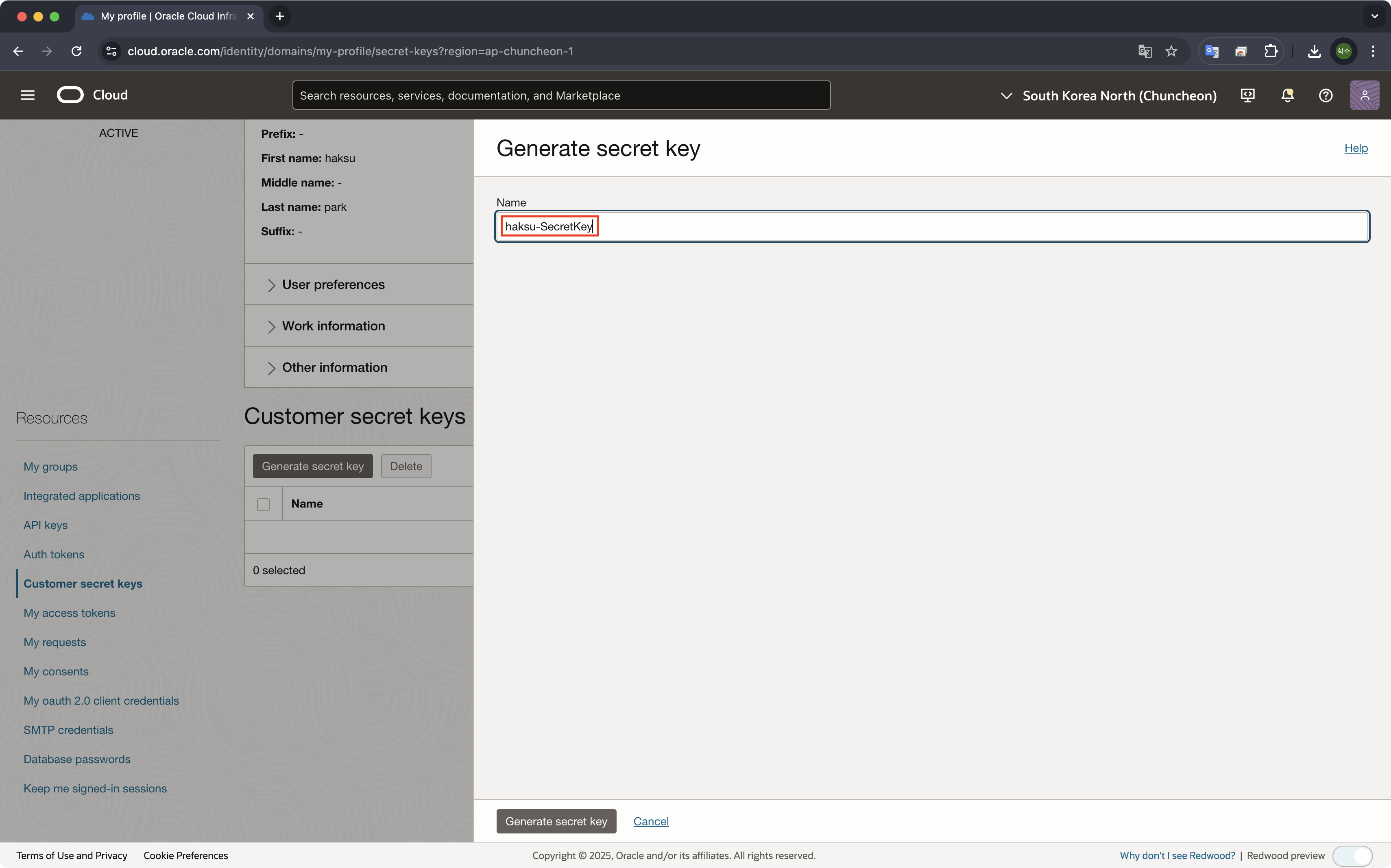 2. 좌측 하단 Resources -> [Customer secret keys -> Generate secret key] 선택