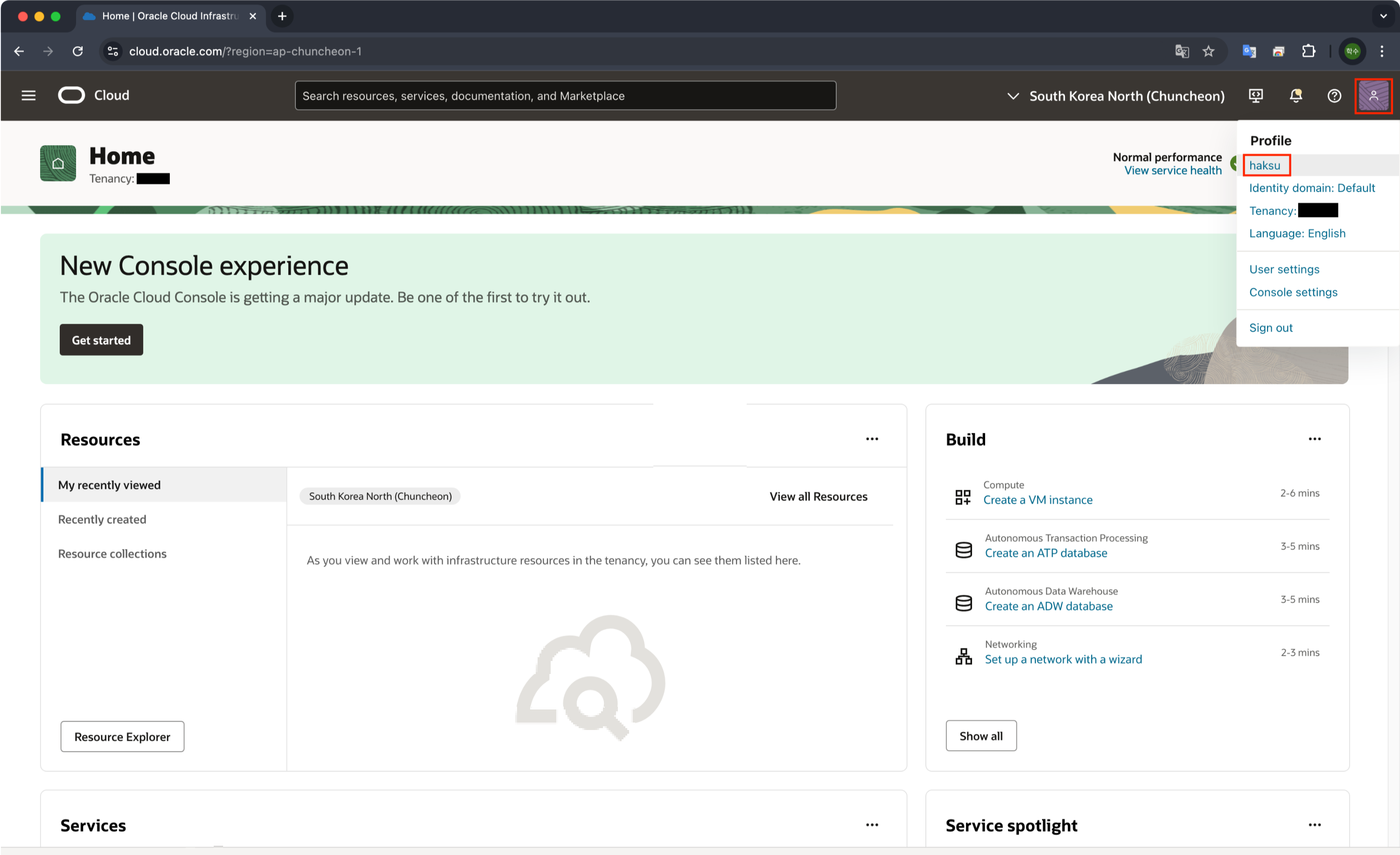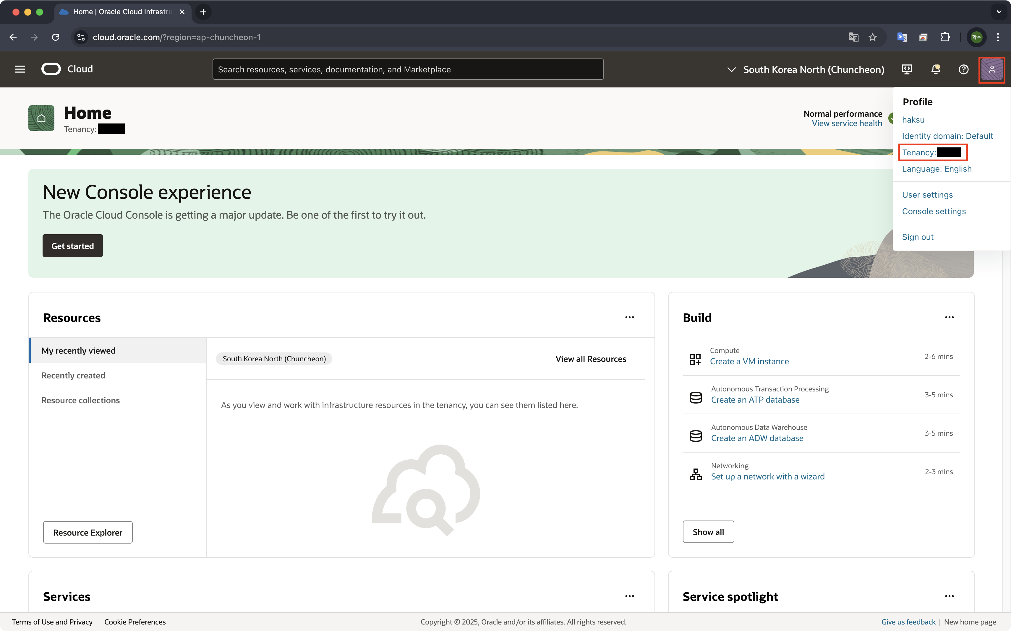 1. 우측 상단 Profile -> Tenancy 선택