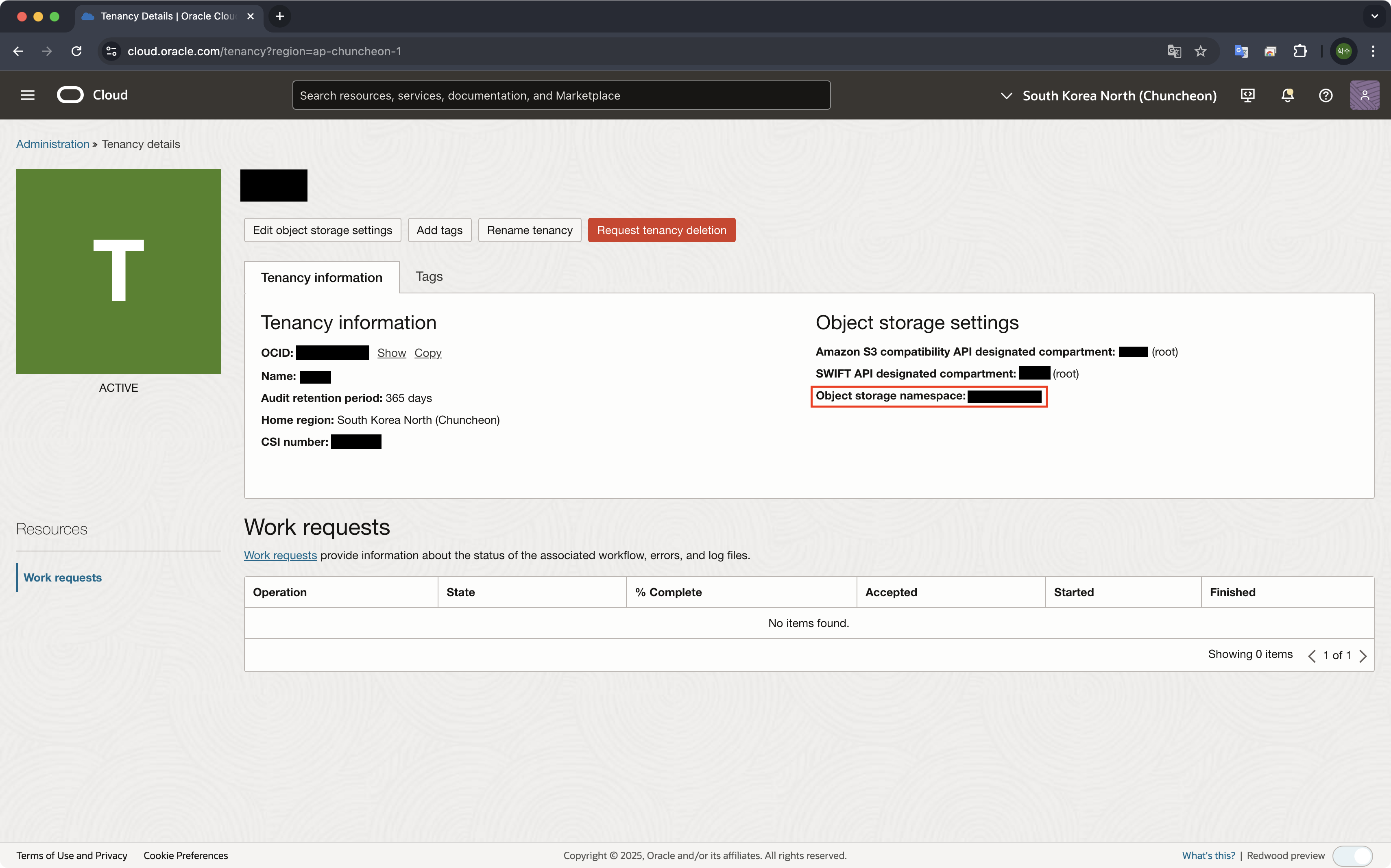 2. Tenancy information -> Object stroage namespace 확인