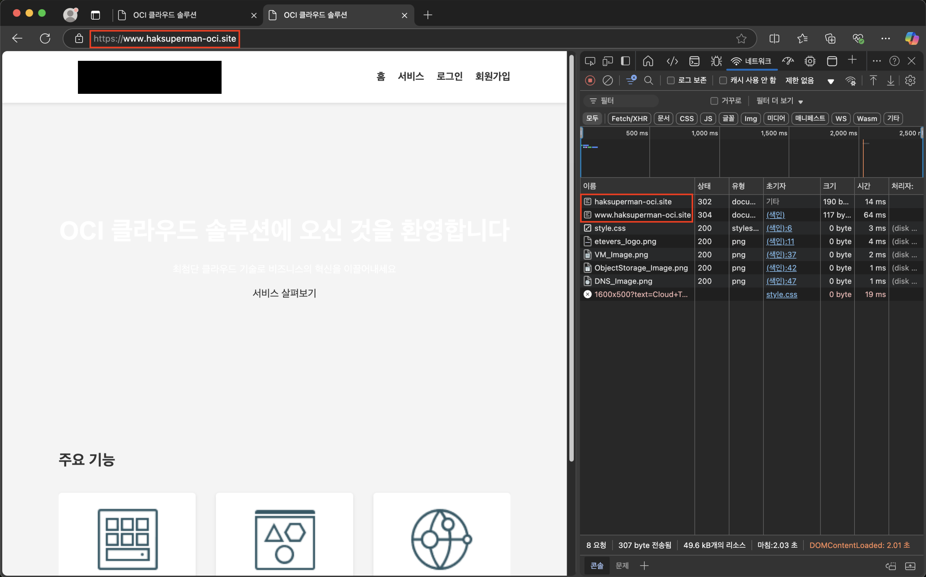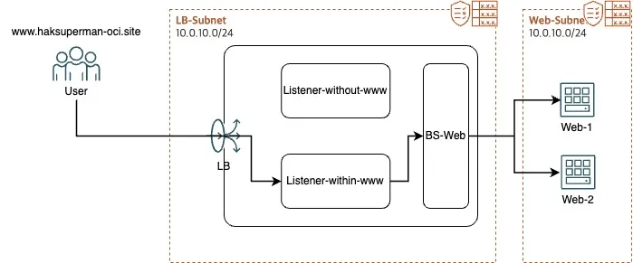 | haksuperman-oci.site -> www.haksuperman-oci.site - DNS Zone이 아닌 Load Balancer에서 구현한 방법으로, 이외 다양한 방법이 존재할 수 있습니다. (Hostname을 통해 Listener를 분기시켜, www가 포함된 Listner로 리다이렉션 시키는 방법) - 모든 환경(웹 페이지, 도메인)은 테스트로 구성된 환경입니다. |