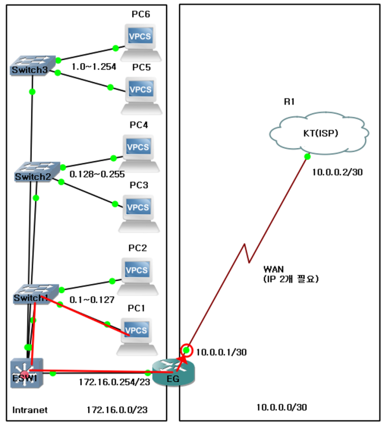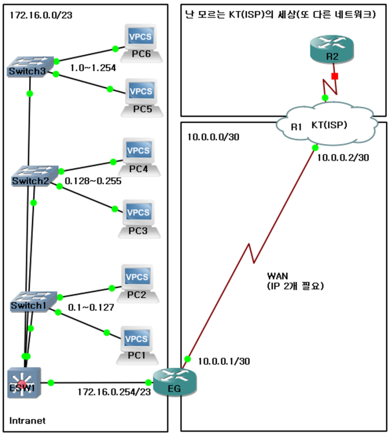-> R1 KT(ISP) 라우터에 172.16.0.0/23 네트워크 대역 라우팅이 이미 되어 있으니, PC들 ip만 부여하면 통신 가능함
