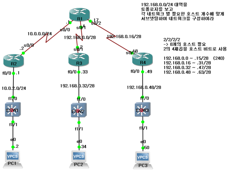 모든 장비(호스트PC)에 IP 부여 후 전 장비 통신 가능하도록 라우팅하여라