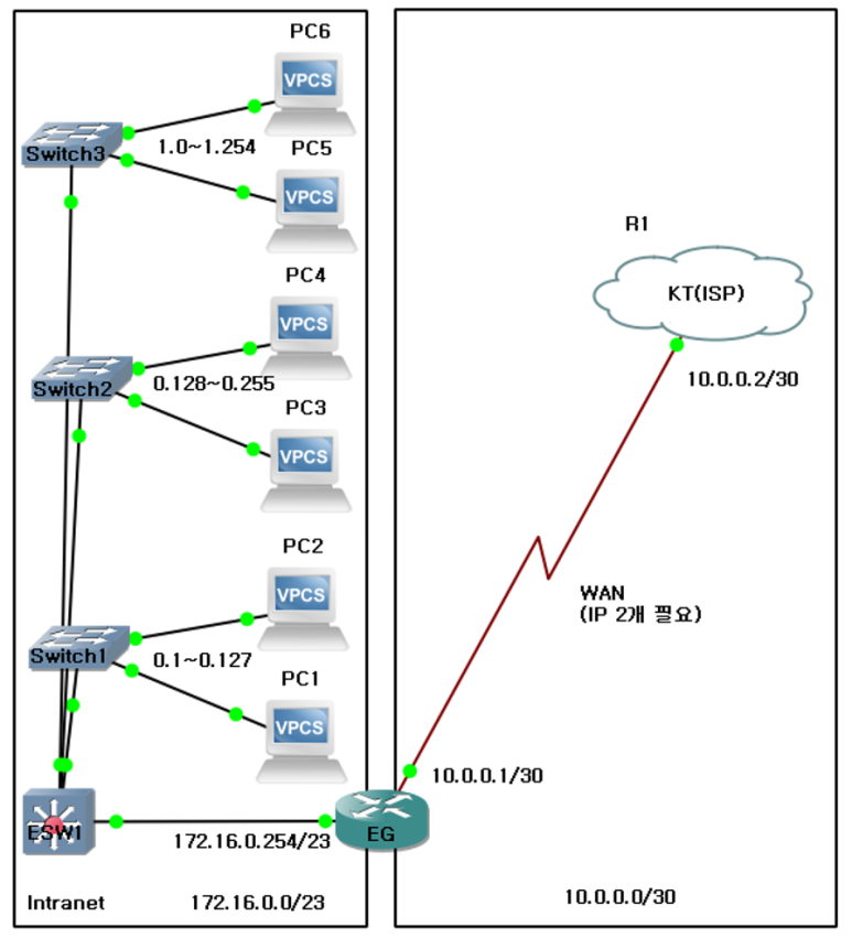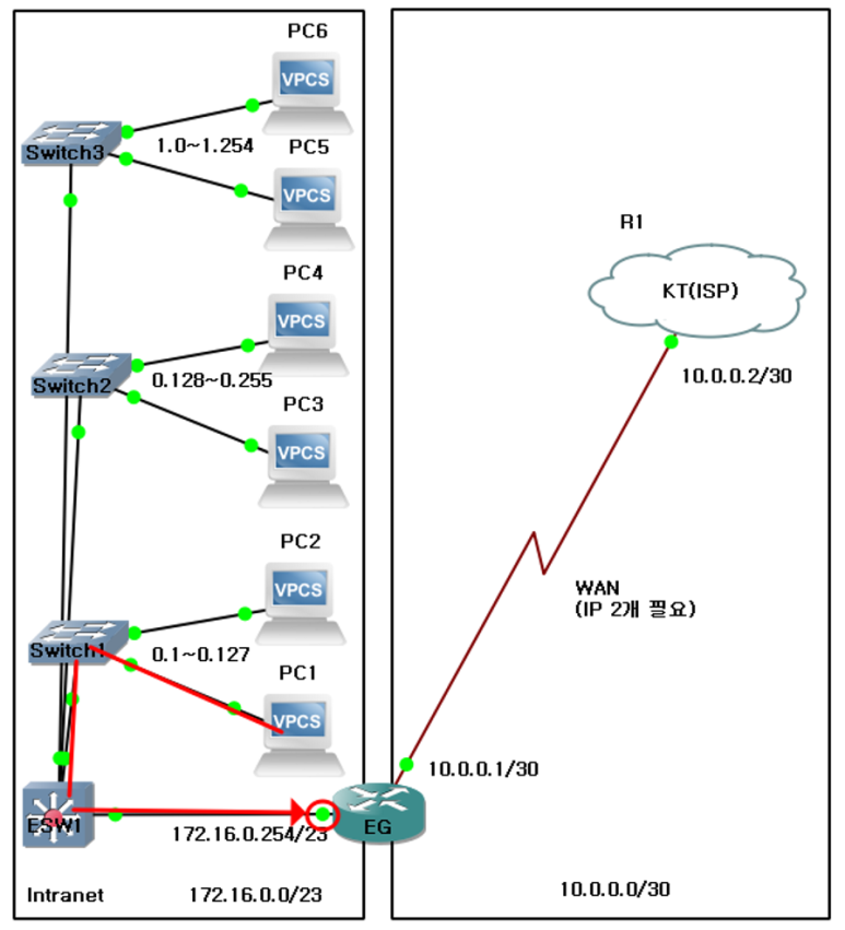 3) 172.16.0.0/23 네트워크 대역까지 왔으니 밑의 스위치 단에서 해결 가능