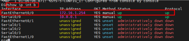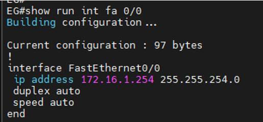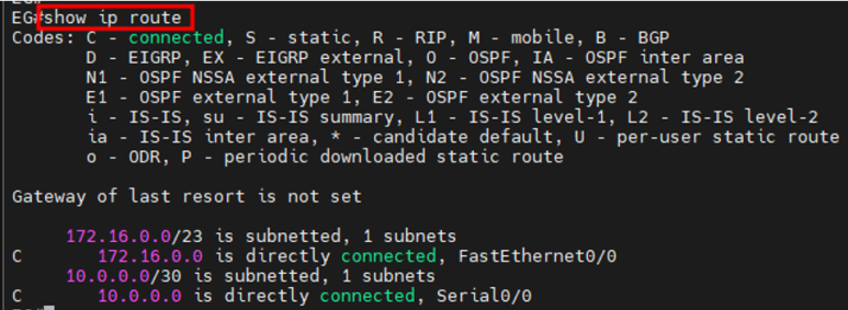 2) EG 라우터에서 172.16.0.1/23 네트워크(172.16.0.0/23)에 가려면 connected 경로(neighbor)에 의해 fa 0/0로 가라