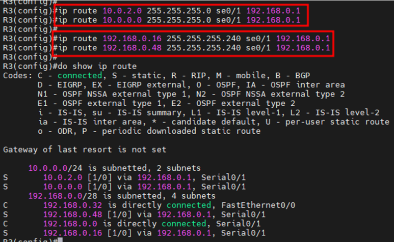 1) R1 KT(ISP) 라우터에서 172.16.0.1/23 네트워크에 가려면 10.0.0.1/30(se 0/0)로 가라.