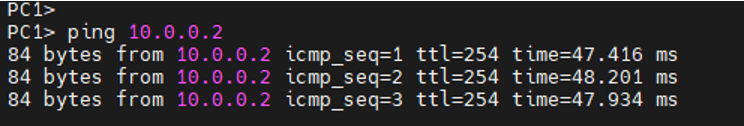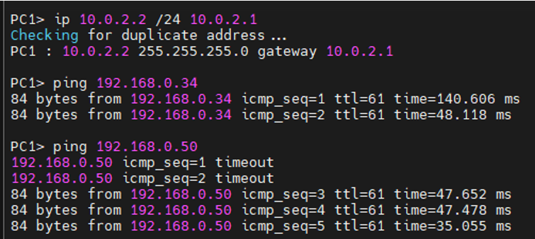 끝단 장비인 PC1에서 ping 10.0.0.1 가능(빨간 라인), 10.0.0.2 불가능(파란 라인)