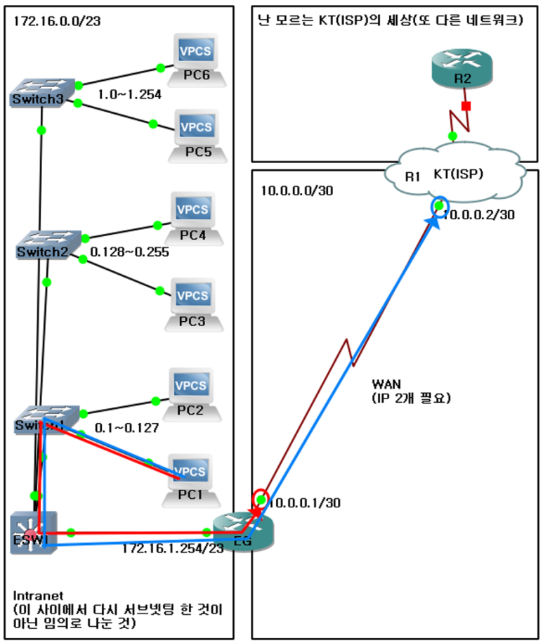 -> connected 라인이라 10.0.0.1 가능, 파란 라인은 패킷 돌아올 때 R1 KT(ISP) 라우터에서 172.16.0.0/23 대역을 몰라서 돌아오지 못함. 불가능
