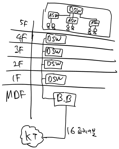 -> 하나의 사옥이라면 각 층마다 광케이블을 넣지 않고 백본 스위치(코어 스위치)에서 랜으로 넣으면 되지만, 각 층마다 다른 업체들이라면 MDF실에 광 포트가 많은 백본 스위치를 두고 각 층에 광케이블을 넣는 방법이 있음